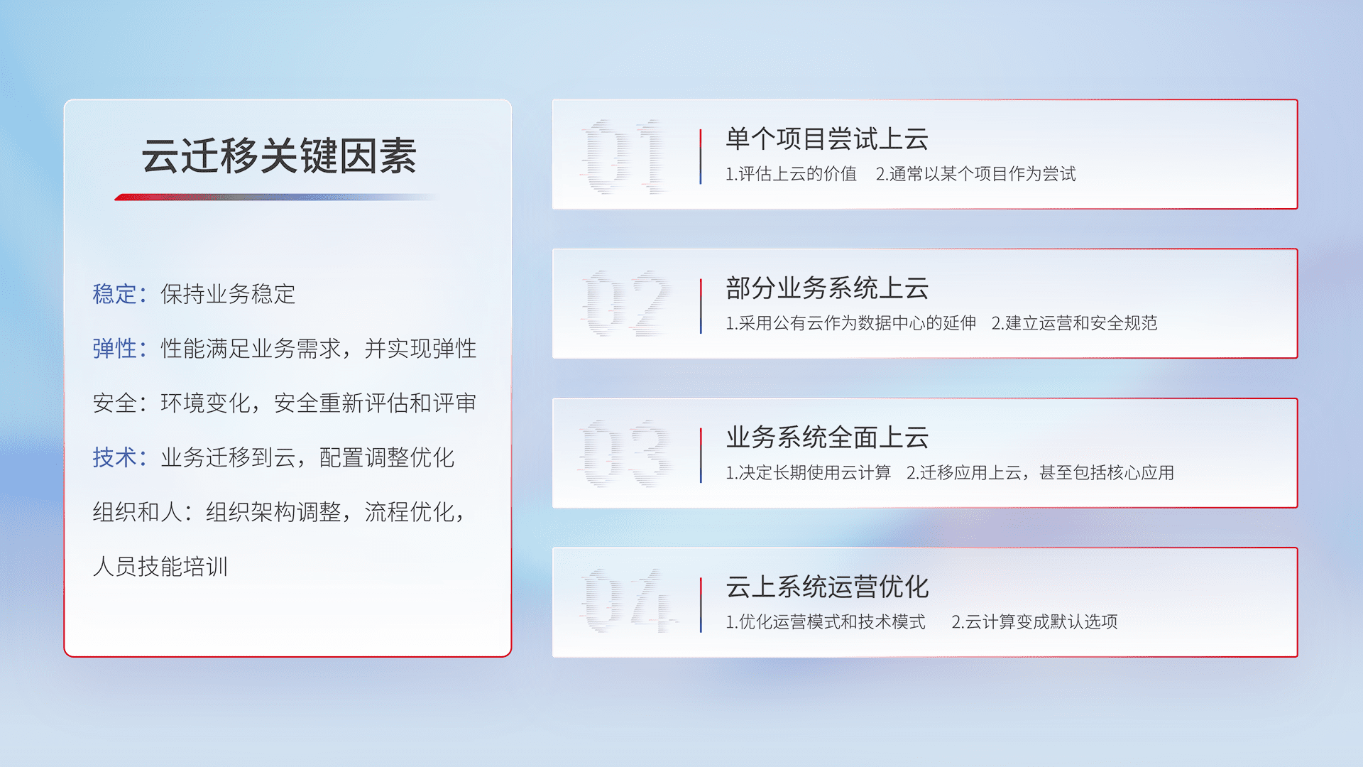 结合实际业务,,从规划设计、、、云平台选型、、、、云原生改造、、数据迁移、、集成交付,,,迁移全过程为客户识别最佳上云路径,,做好风险识别管理,,,设计网络架构、、、身份权限、、、安全审计合规、、、、操作审计、、、、日志审计、、监控告警策略、、、、多站点容灾设计等,,,对云上基础设施进行整体规划,,,,提升IT治理水平,,以满足弹性、、、、高可用、、、、高性能的需求。。。