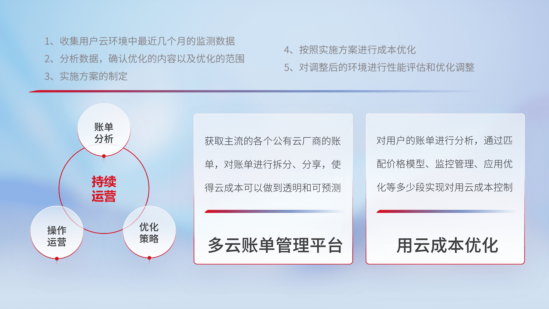 通过多云纳管,,以统一的资源数据模型把客户的云资源进行抽象和封装,,,进而实现对多云资源的统一操作,,,保障云资源管理的可靠性、、稳定性与可用性。。。量身定制化运维内容,,,,配置、、、开发运维、、、、补丁管理、、备份、、、监控、、、、认证和访问管理、、、审计和日常巡检等,,保障在用云过程中的可靠度,,,,稳定度以及高可用率。。。。