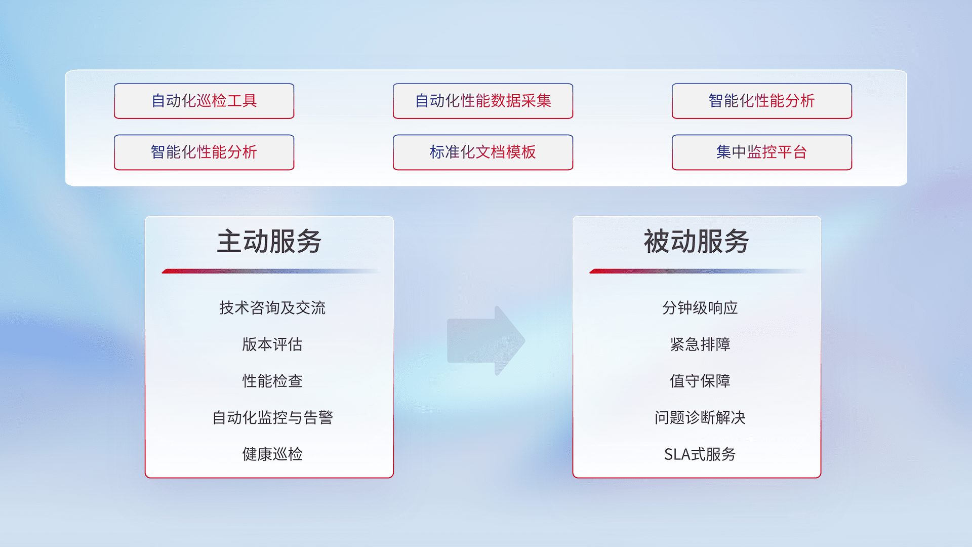 智能化工具和标准化文档,,保障服务质量,,,,提供主动服务(包含技术咨询、、、版本评估、、性能检查、、、自动化监控与告警、、、健康巡检)和被动服务包含(分钟级响应、、紧急排障、、、值守保障、、、问题诊断解决、、、、SLA服务)。。。